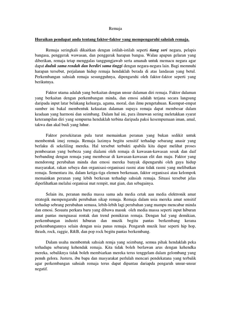 KARANGAN RAMALAN 1 SPM 2017. Dan disamping itu nasehat tersebut juga dapat membangun ilmu takwa kepada Tuhan yang Maha Esa sehingga para remaja mempunyai budi pekerti yang luhur. Bagi mereka yang diajar sejak kecil mengamalkan bahasa yang baik dan beradab mungkin kurang senang jika ada.