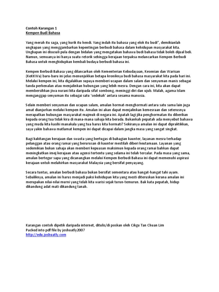 Koleksi Contoh Karangan SPM Bahasa Melayu Sijil Pelajaran Malaysia Berikut adalah contoh-contoh karangan mengikut tema yang selalu digunakan sebagai tajuk soalan karangan Bahasa Melayu. Full PDF Package Download Full PDF Package. Bincangkan kepentingan amalan berbudi bahasa dalam masyarakat.
